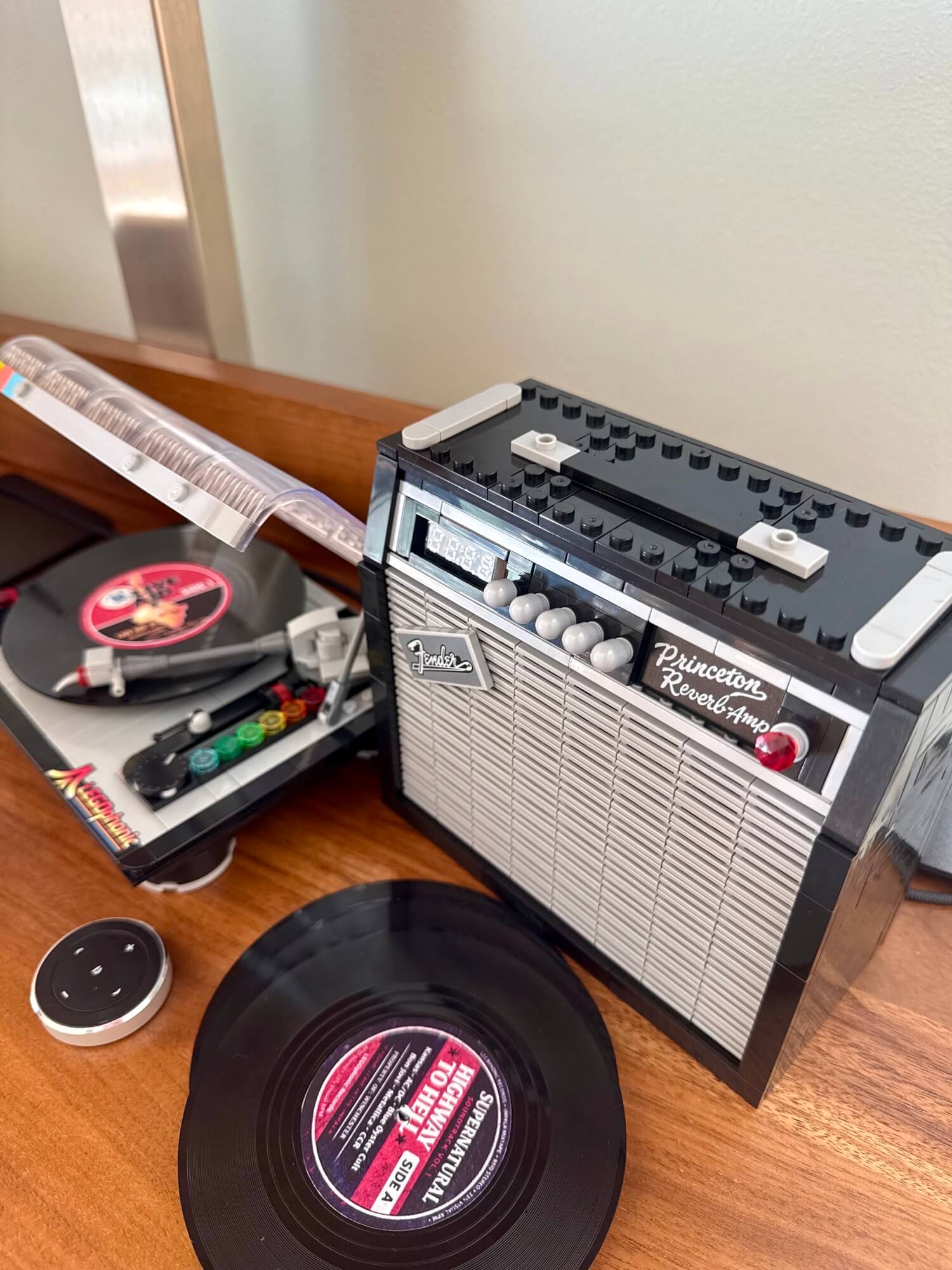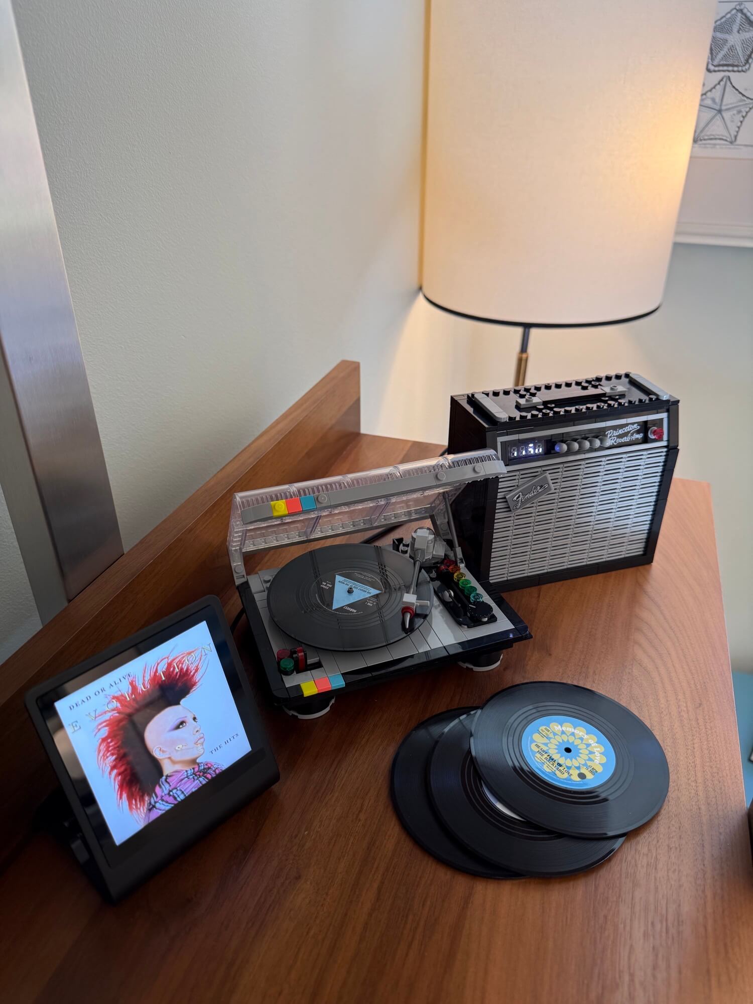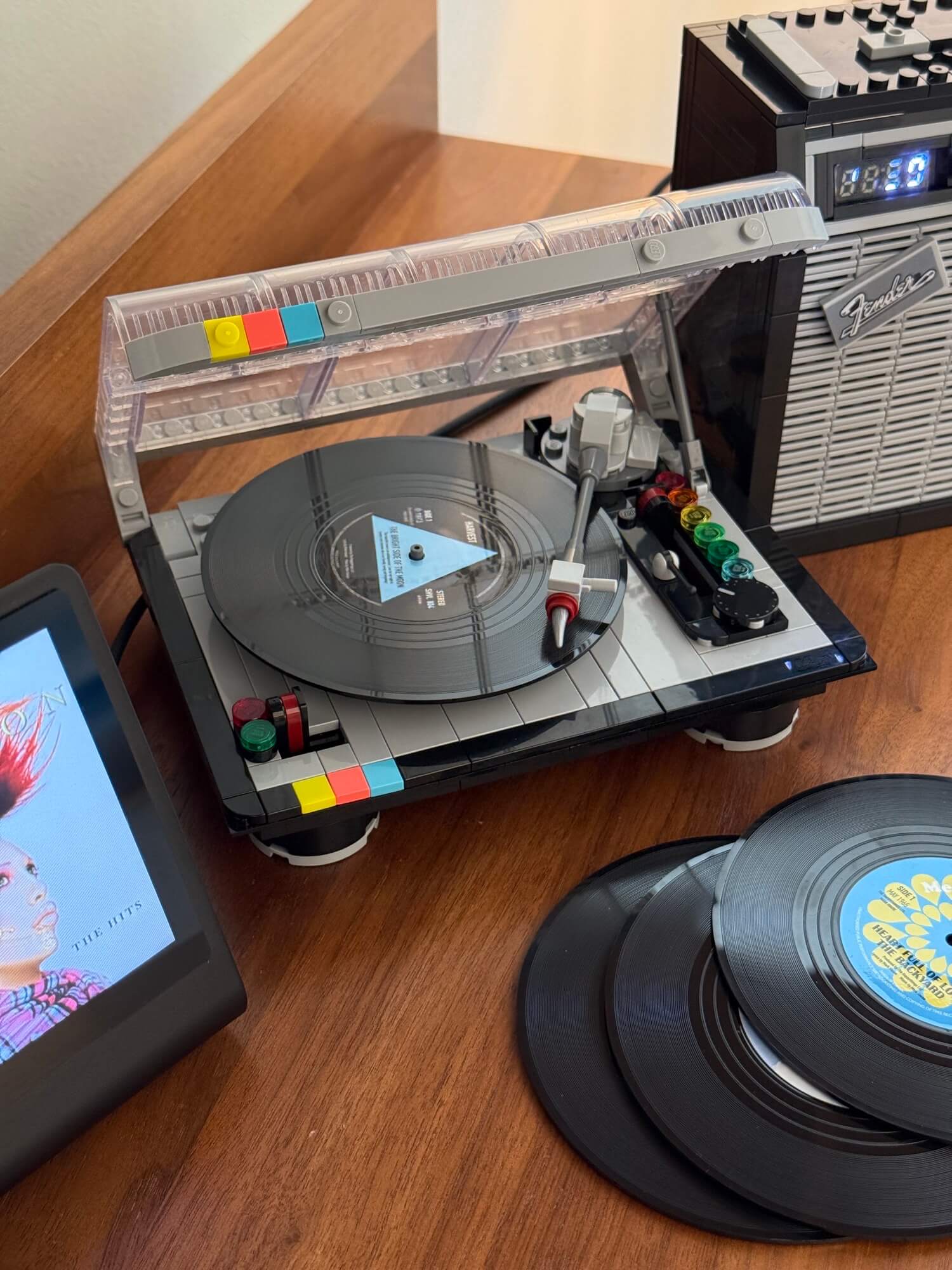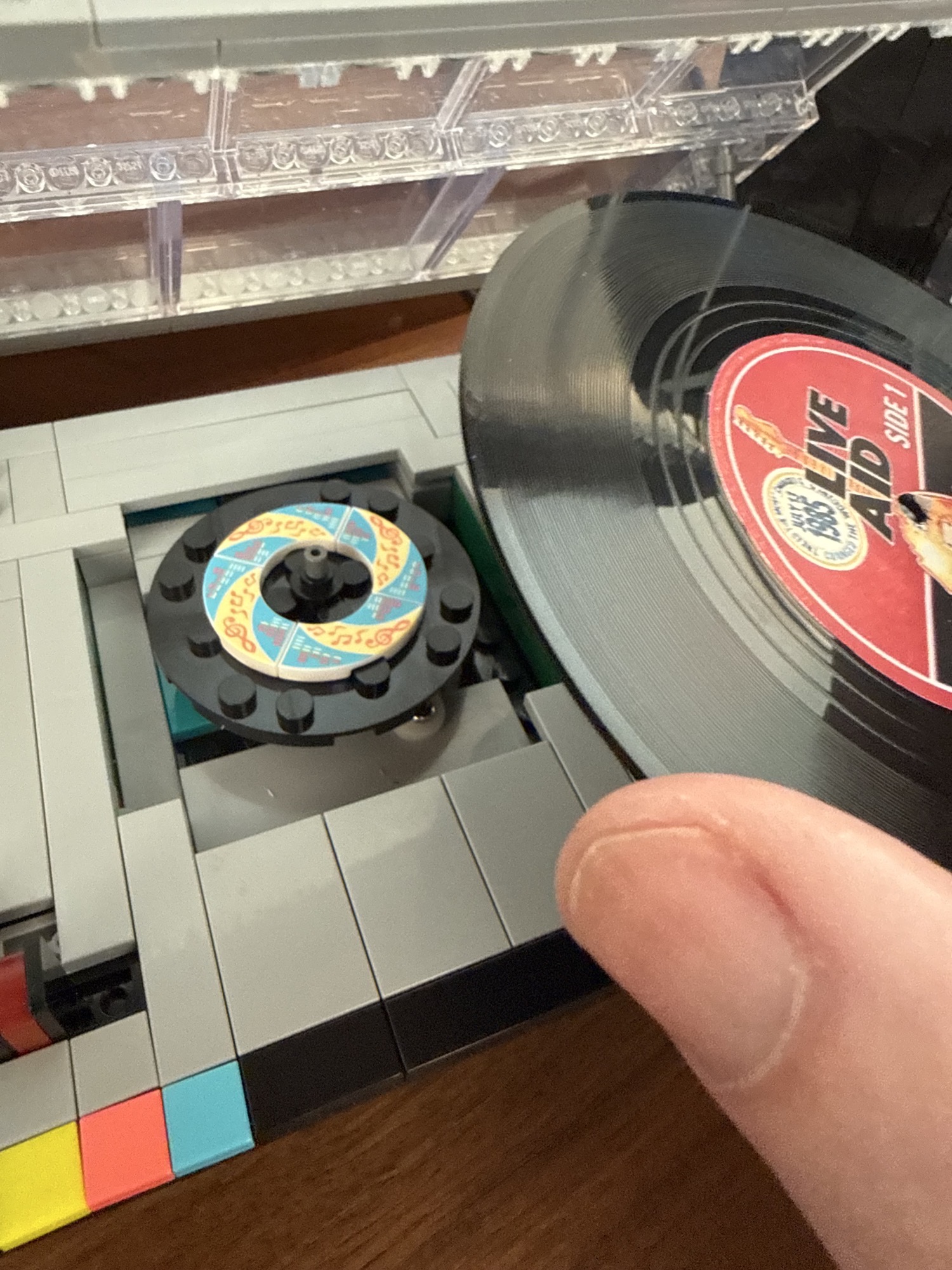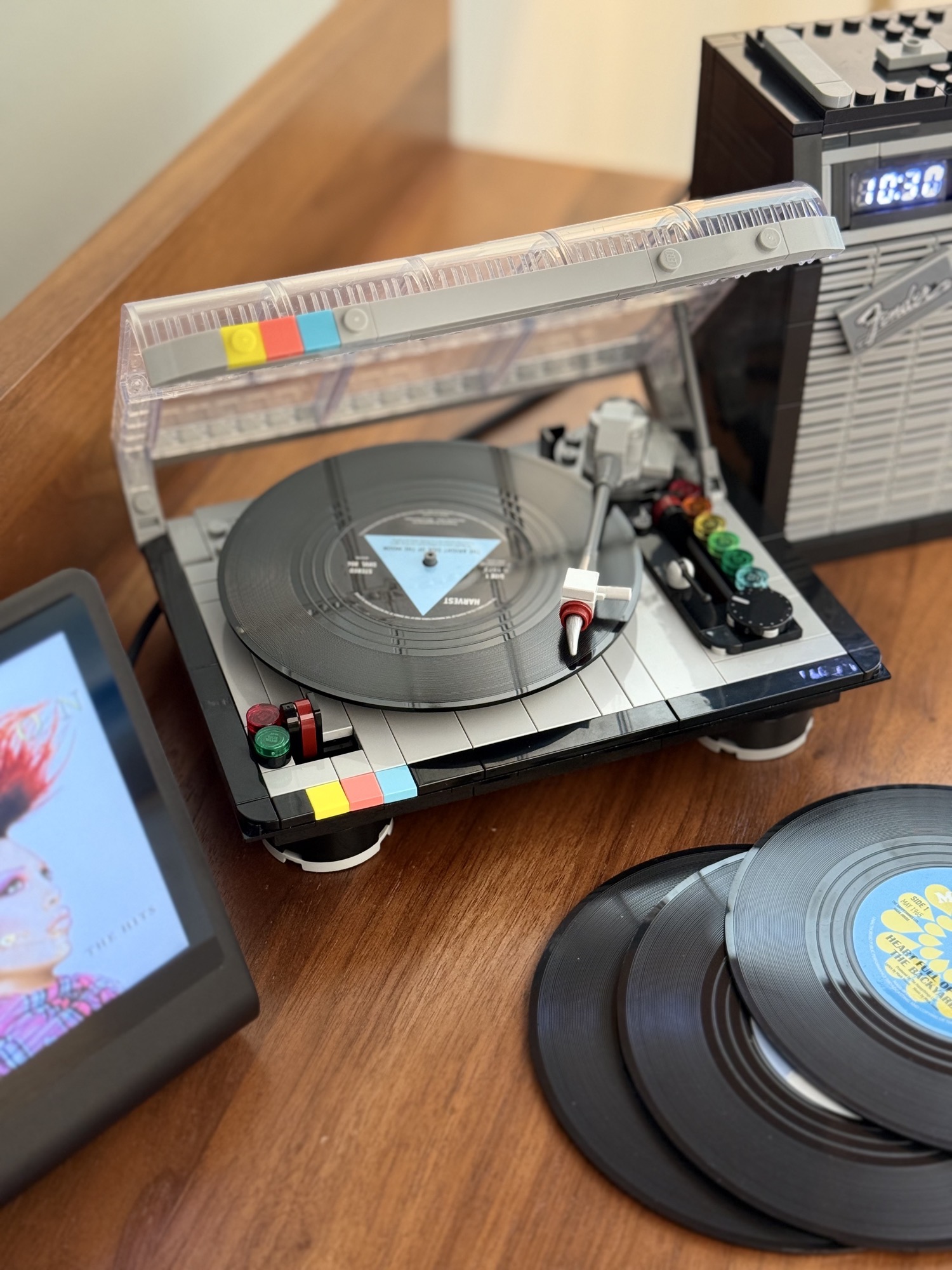 A LEGO turntable provides the visual structure